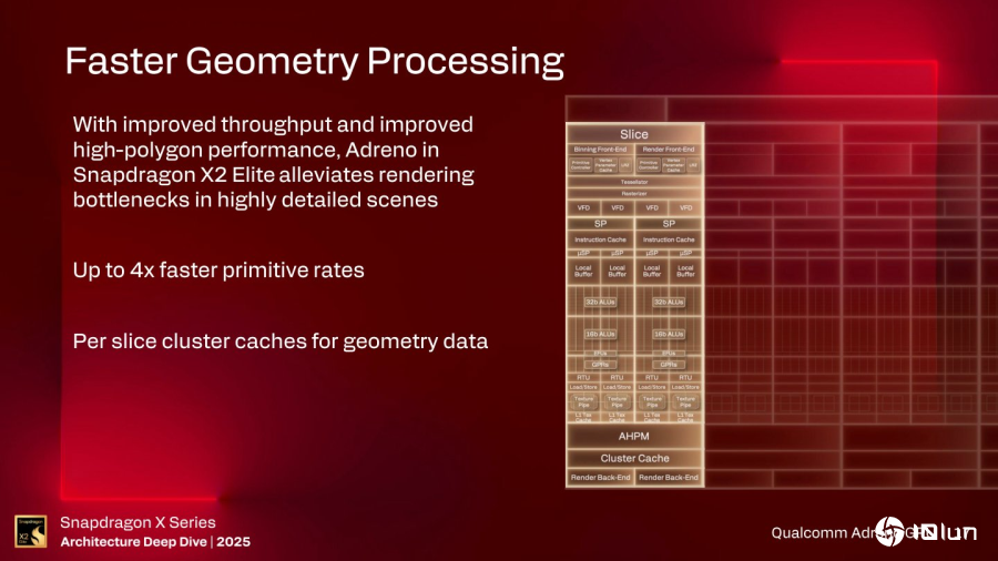 Adreno X2 GPU改善数据吞吐量与多边型运算能力,可以提供4倍于前代产品的几何图形运算性能,并可使用切片中的集群缓存内存存储几何数据。
