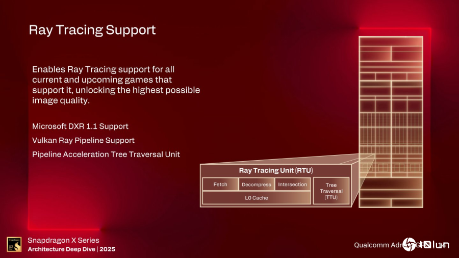 Adreno X2 GPU支持DirectX 12.2 Ultimate、Vulkan 1.4与OpenCL 3.0等API也支持DirectX DXR 1.1与Vulkan Ray Tracing等光线关注API,有助于提高游戏的兼容性,以便执行更多Windows游戏。