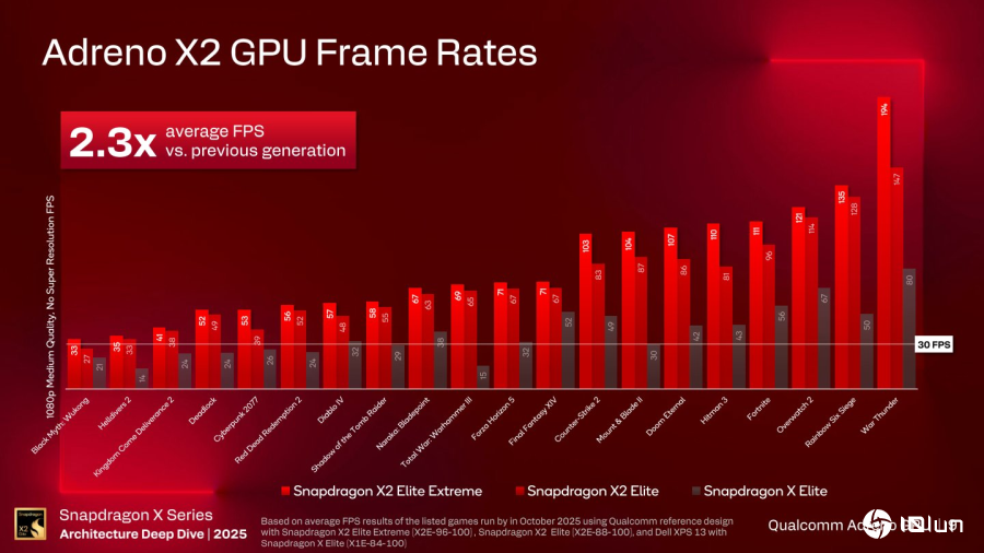 Adreno X2 GPU的平均游戏性能达到前代产品的2.3倍,能将多款游戏在1080p分辨率、中等画质设置的FPS扛过30帧门槛。