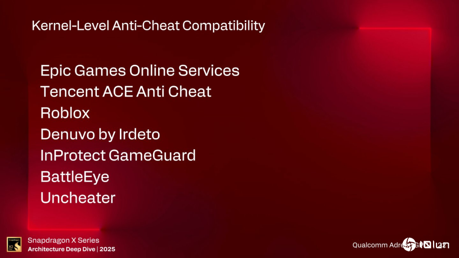Snapdragon X2平台在操作系统核心层级支持Epic Games Online Services、Tencent Anti-Cheat Expert、Roblox Hyperion、Denuvo by Irdeto、InProtect GameGuard、BattleEye、Uncheater等防作弊机制,降低游戏无法执行的问题。