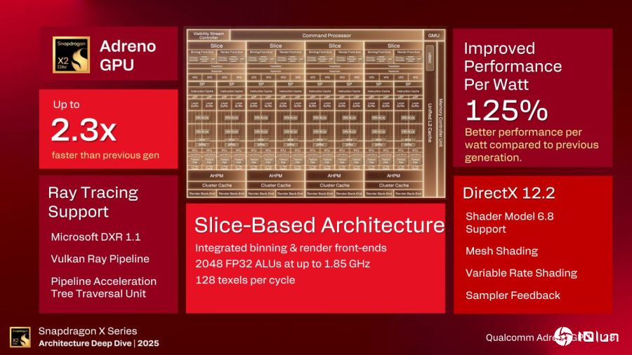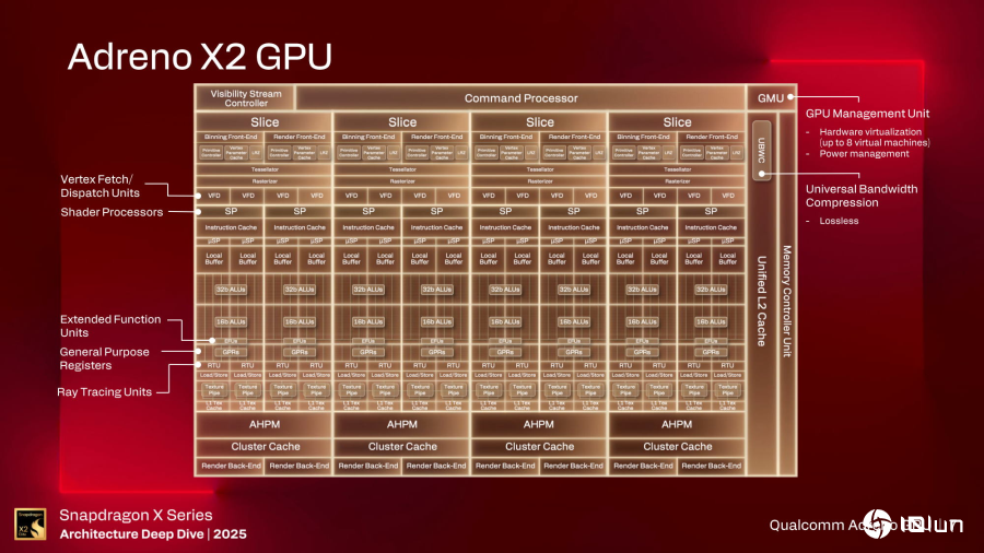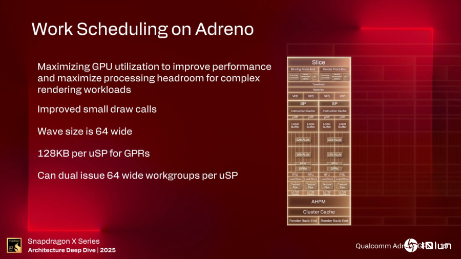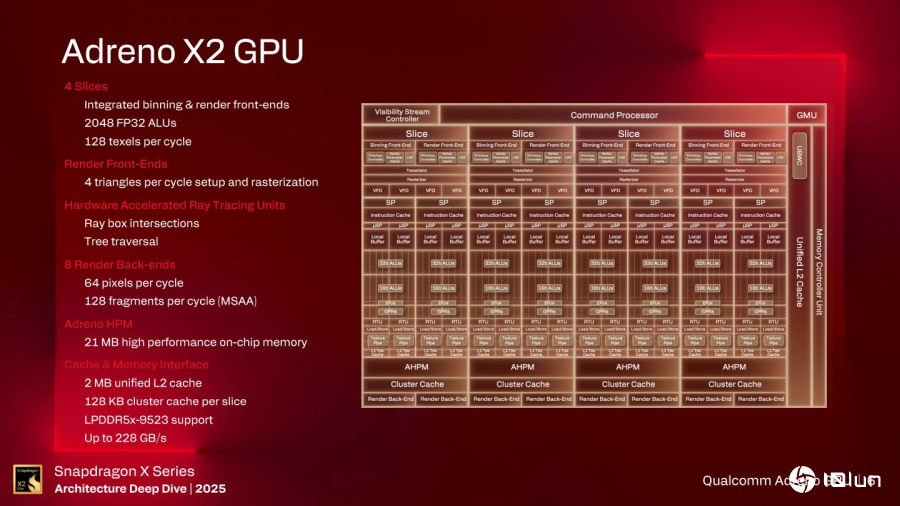 Adreno X2 GPU最多由4组切片(Slice)构成,每组切片具有指令缓存内存、材质缓存内存,以及容量为128 KB的集群缓存内存,GPU共享2MB L2缓存内存,并支持带宽达228 GB/s的LPDDR5x-9523外部内存。