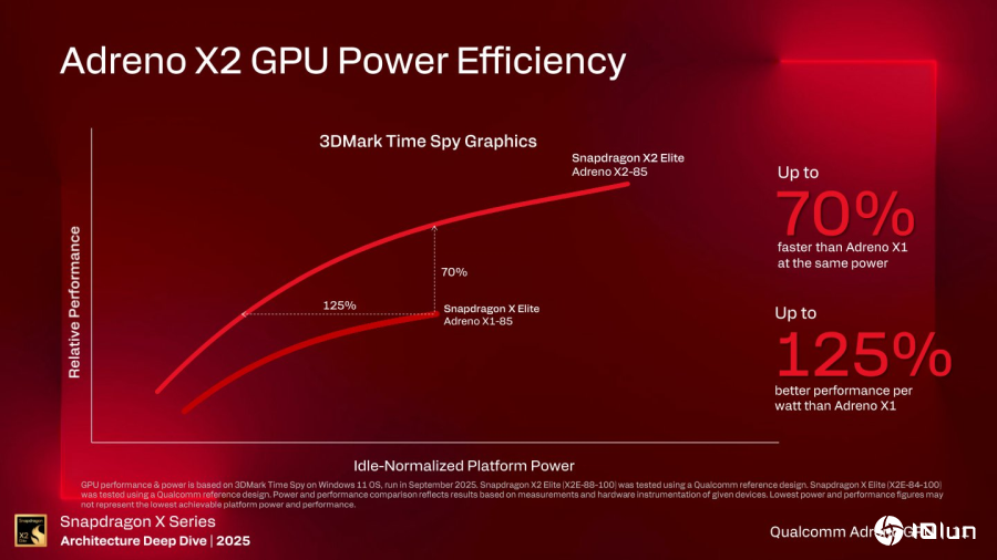 与前代GPU相比,Snapdragon X2平台的Adreno X2 GPU性能增长130%,电力效率也改善125%。