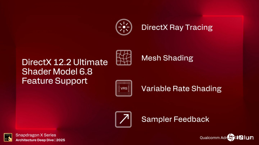 Adreno X2 GPU支持DirectX 12.2 Ultimate、Shader Model 6.8、DXR光线关注,能带来更高的Windows游戏兼容性,此外它也支持Mesh Shading、VRS、Sampler Feedback等功能,以改善游戏的性能表现。