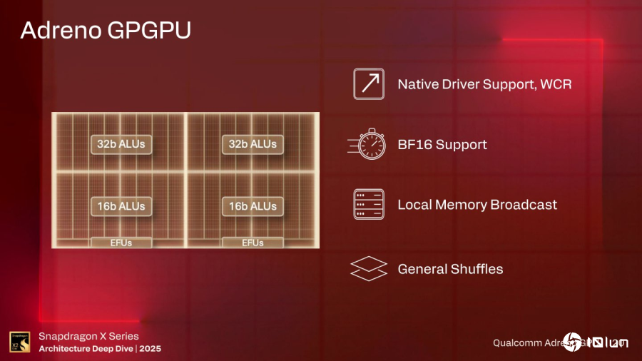 在GPGPU的通用运算方面,Adreno X2 GPU的切片提供32 bit与16 bit ALU(Arithmetic Logic Unit,算数逻辑单元)以及EFU(Elementary Function Unit,初等函数单元)各2组,支持Windows Copilot执行环境(Windows Copilot Runtime,WCR)与BF16数据类型,能够应用于加速AI运算。