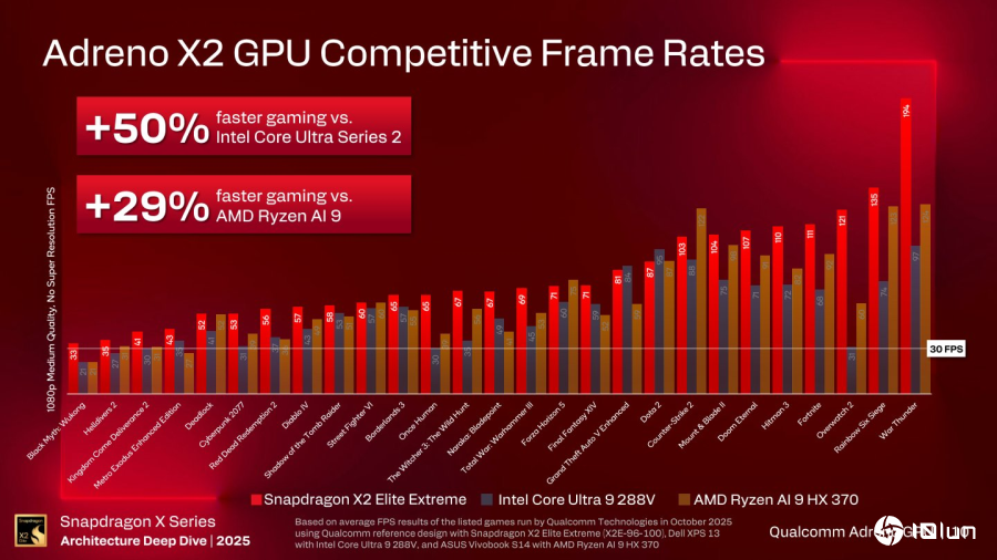Adreno X2 GPU与竞争对手Intel Core Ultra 9 288V、AMD Ryzen AI 9 HX 370相比,性能领先分别达到50%与29%。