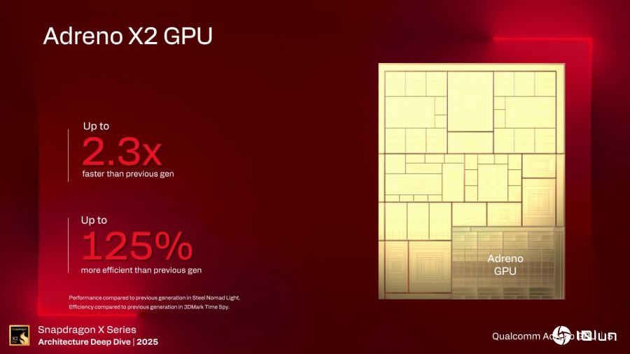 Snapdragon X2平台的采用全新Adreno X2绘图处理器,性能可达前代产品的2.3倍,电力效率改善最高达125%