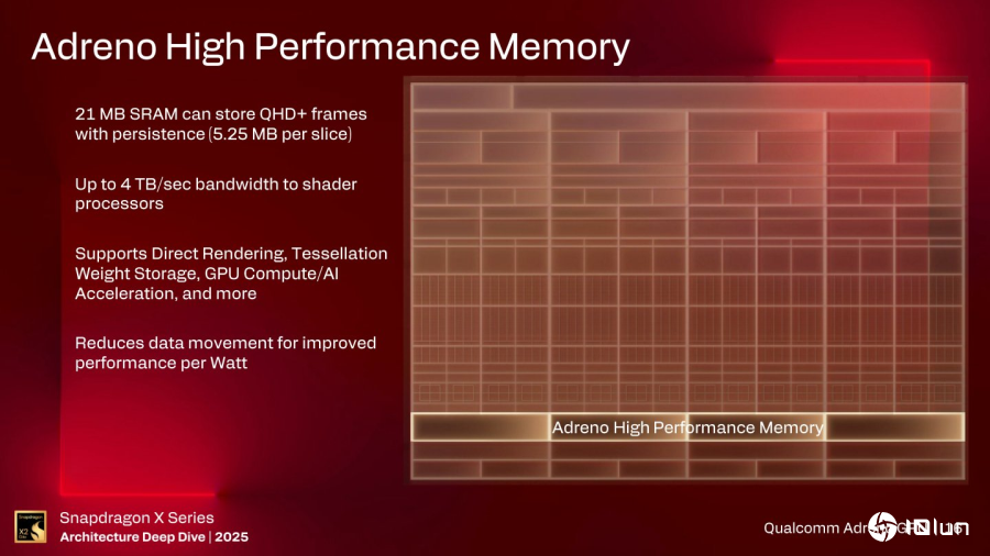 每组切片搭载容量为5.25 MB、带宽达4 TB/s的SRAM作为Adreno高性能内存(Adreno High Performance Memory,AHPF),4组切片提供21 MB总容量,能够用于Direct Rendering、曲面细分(Tessellation),以及存储AI运算的权重,节省数据搬运并改善电力效率。