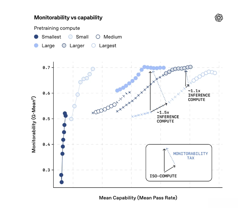 最后,OpenAI提出了一个“监控税(Monitorability Tax)”的概念。简单来说,如果你希望AI更安全、更可被监控,通常需要让它花更多算力去思考,或是使用规模较小但推理能力较强的模型配置。