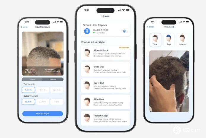 Glyde配合专用应用程序使用,内置多种经测试发型选择,涵盖不同头型及发质。应用程序提供语音及视频即时指导,逐步引导用户完成理发过程。整项理发程序可在10分钟内完成,适合1英寸或以下短发全头理发,或中长发型侧面及后方修剪。