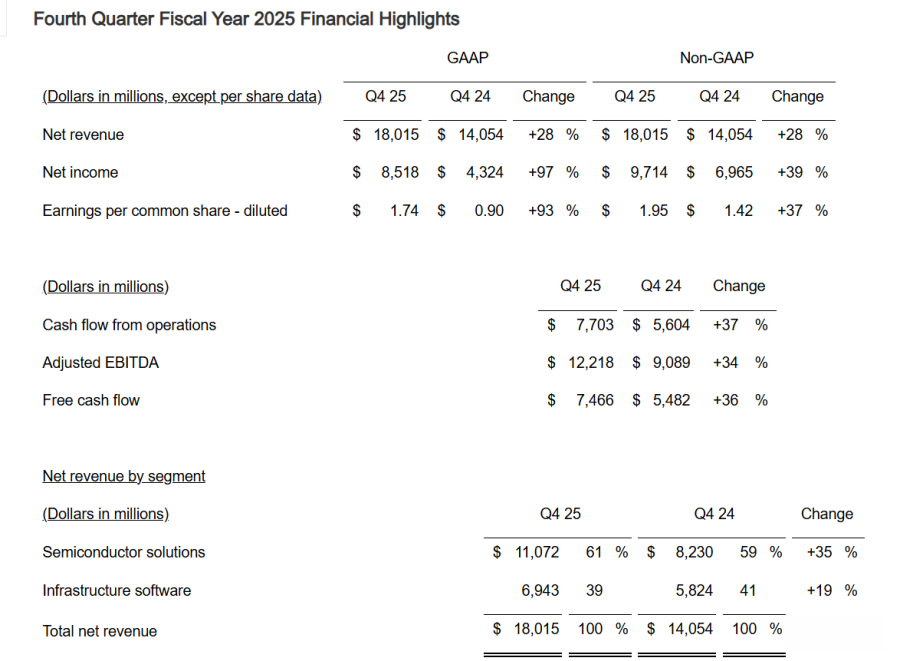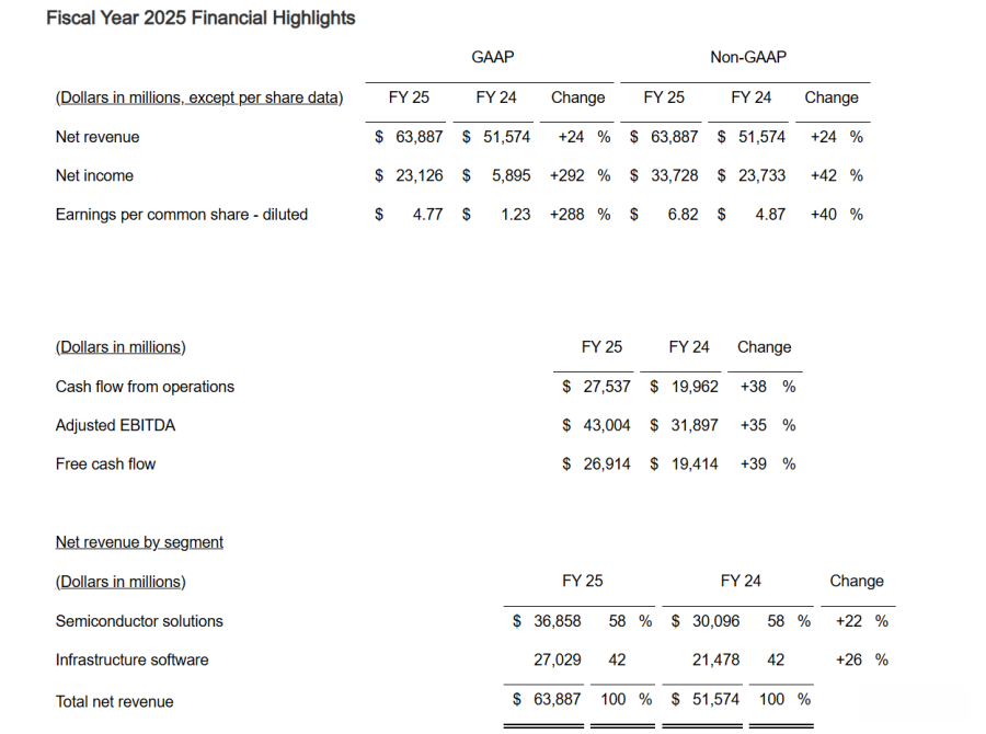 软件部门成为获利支柱来支撑稳健财报表现尽管面临AI业务带来的边际利润压力,博通的整体财务表现依然强劲,体现了其灵活的战略。在截至11月2日的上一季财报中,博通的营收略高于180亿美元,年增28.2%,较上一季增加12.9%。营收金额增加了62.3%,达到75.1亿美元。净收入增长了97%,达到85.2亿美元,部分归功于一笔16.5亿美元的税收收益。