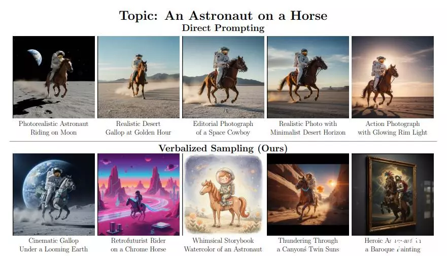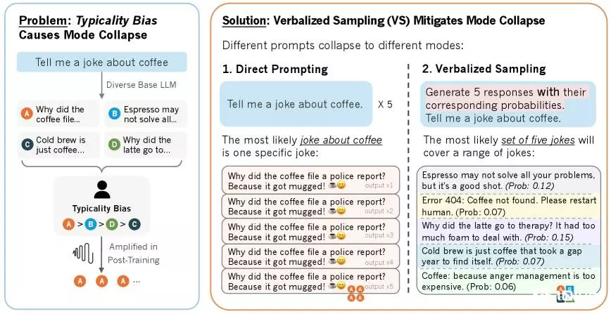 在大型语言模型(LLM)调校阶段,经常会出现“模式崩塌”(mode collapse)现象:模型倾向生成重复、守旧或缺乏创意的回应。传统上,这种情况多被归因于算法设计(如RLHF强化学习或顺序优化)所造成。但来自美国斯坦福大学(Stanford University)与东北大学(Northeastern University)等机构的研究团队指出,导致模式崩塌的根本原因之一其实是“人类偏好数据”中的典型性偏差(typicality bias)。他们进一步提出一种称为“口述采样”(Verbalized Sampling, VS)的提示设计策略,以低成本且无需重新训练模型,即可提升模型回应的多样性。
