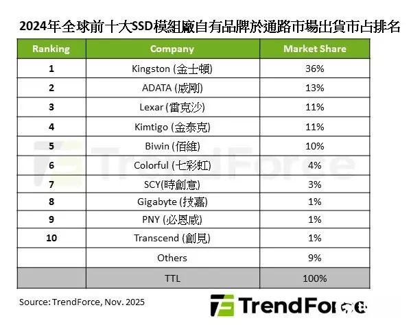 SCY首次进入渠道出货排名前十,主要受益于中国渠道市场的渗透率增长,位居第七名。Gigabyte、PNY和Transcend分列第八至第十名,Gigabyte延续其电竞品牌效应稳定出货,PNY凭借北美、欧洲渠道维持一定市场占有率,Transcend则明确聚焦工控与专业应用市场。