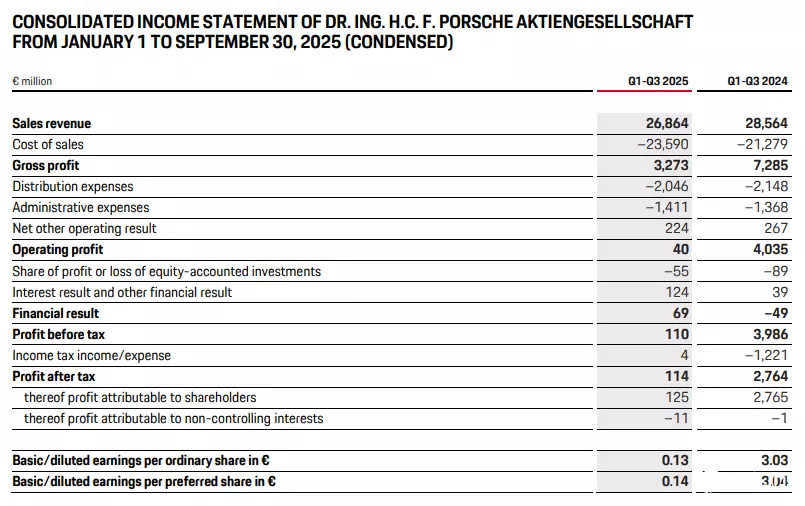 保时捷今年前九个月的营业利润累积暴减99%至4,000万欧元,进行重组导致的一次性成本(包括对电动汽车和电池计划的减记)已27亿欧元,预估全年一次性成本将高达31亿欧元。