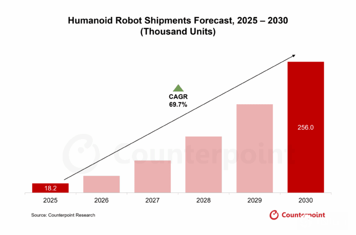 根据调查机构Counterpoint Research最新研究报告,人形机器人与自动驾驶汽车正成为“实体AI”(Physical AI) 商业化的两大主要应用方向。Counterpoint预期2025至2030年间,全球人形机器人出货量的年复合增长率将达69.7%,主要受益于应用场景拓展、AI能力提升及硬件成本下降。