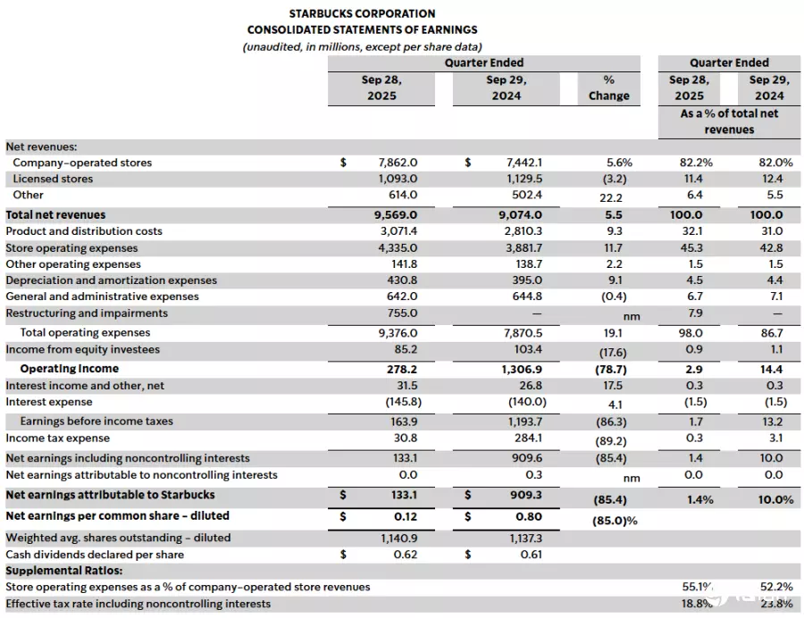 CNBC、路透等外媒报道,星巴克于29日美股盘后公布,2025会计年度第四季(截至9月30日为止),营收为95.7亿美元,优于LSEG统计的分析师预估值93.5亿美元,经调整每股盈余为52美分,逊于市场预期的56美分。