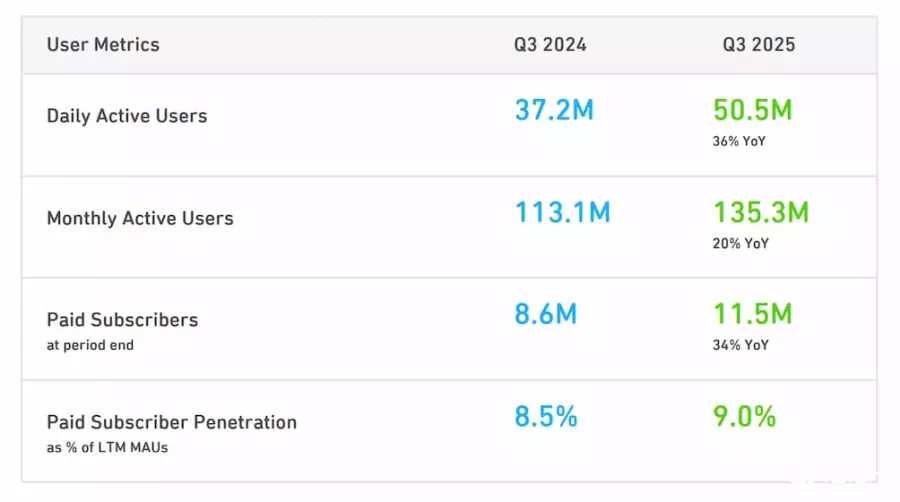 该公司付费订阅用户增长至1,150万人,略高于StreetAccount预期的1,138万人;其中,日活跃用户(DAU)5,050万人,低于分析师预期的5,120万人;月活跃用户(MAU)1.353亿人,同样低于分析师预期的1.374亿人,都未达到预期。