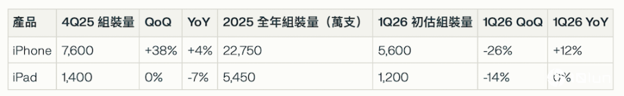 至于2026年第一季,iPad组装量预估约1,200万支,季减14%、年持平,整体表现仍符合季节性走势。大摩认为,整体来看,iPhone将是2026年初苹果硬件动能的主要支撑来源。
