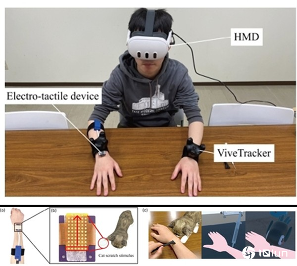 研究团队提出的新方法结合头戴式显示器(HMD)与电触觉设备。当参与者接受电刺激时,VR环境会同步呈现猫咪抓挠手部的动画。这样的设计让大脑重新诠释刺激来源,将原本应感受到的疼痛转化为与猫咪互动的触觉错觉,进而减轻不适。