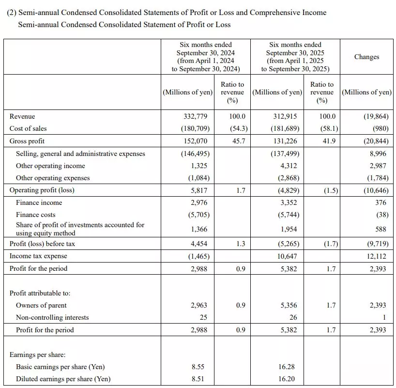 Nikon 6日盘后公布今年度上半年(2025年4-9月)财报:因半导体微影设备销售减少,加上受美国关税政策影响,总营收较去年同期下滑6.0%至3,129.15亿日元,整合营业亏损额为48.29亿日元(去年同期为营业利润58亿日元),就历年同期来看,为5年来首度陷入营业亏损,整合纯利润受益解散子公司会计确认一次性获利而暴增80.7%至53.56亿日元。