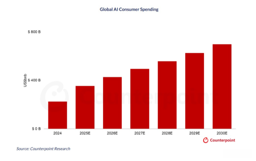 根据市调单位Counterpoint Research于发布的最新报告《Global AI Consumer Spends Forecast, 2024–2030》表示,生成式AI正快速重塑全球科技产业版图。报告指出,无论是针对消费者的AI软件,或是支撑其运算需求的AI硬件市场,皆呈现明显的加速增长趋势。
