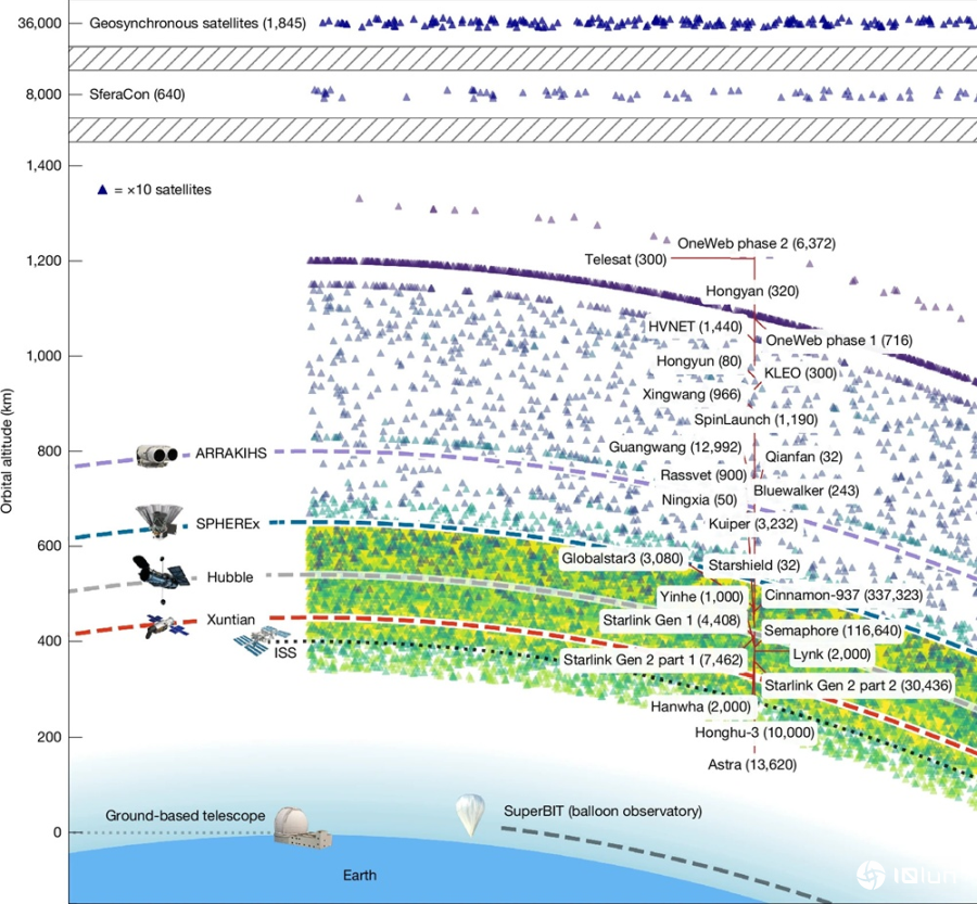 此图将卫星的高度与哈勃太空望远镜、巡天太空望远镜(中国空间站望远镜)、SPHEREx以及研讨商议中的ARRAKIHS任务的轨道进行比较。卫星星座的标签显示了计划中的卫星数量。每个符号代表10颗卫星。