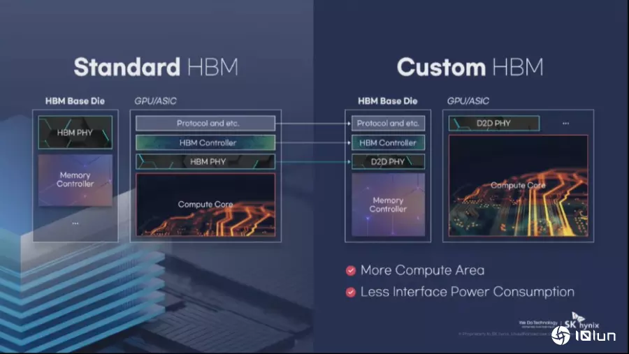 在定制化HBM (Custom HBM),SK海力士强调,AI市场正在从商品化扩展到推论效率和优化。因此,HBM也从传统产品演变为定制化产品。定制化HBM是将GPU和ASIC的特定功能集成到HBM基座上的产品,以反映客户需求。这项技术能够最大化GPU和ASIC的性能,同时通过HBM减少数据传输功耗,进而显著提高系统效率。