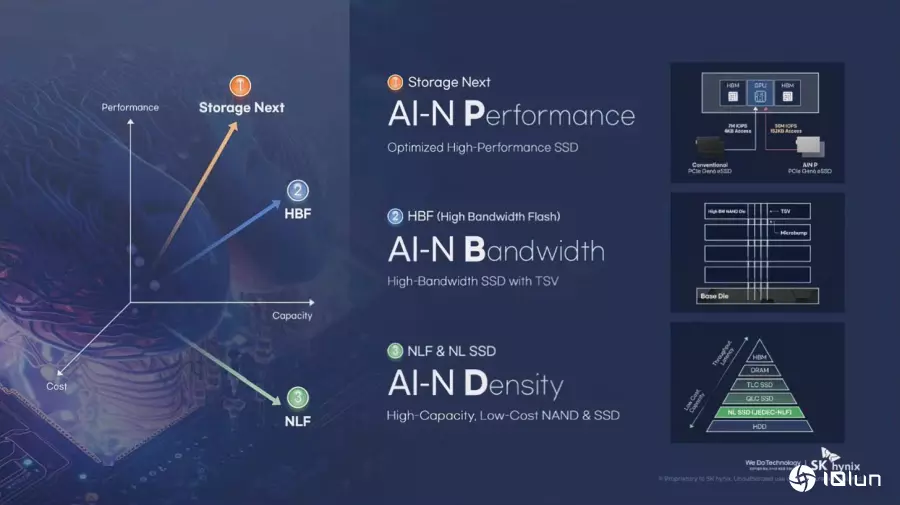 除了DRAM之外,在AI NAND (AI-N) 方面SK海力士也正在准备三种下一代存储解决方案。
