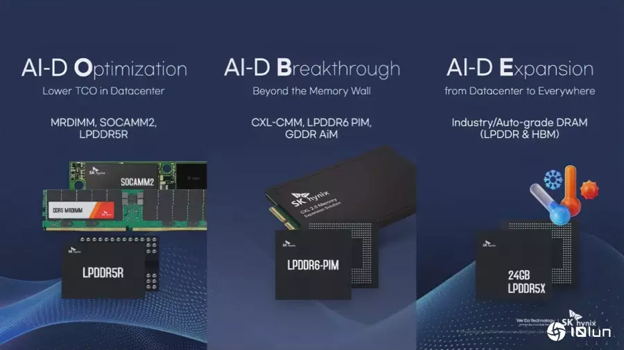 1. AI-D O(Optimization)的优化,这是一种低功耗、高性能的DRAM,目的在降低总体拥有成本(TCO)并提高运营效率。该解决方案包括MRDIMM(多任务秩双列内存模块,通过同时运行两个秩以增强速度)、SOCAMM(小型外形压缩附着内存模块,用于AI服务器的低功耗DRAM内存模块)以及LPDDR5R(低功耗双倍数据速率5 RAS,用于移动产品,具备可靠性、可用性、可服务性(RAS)特性的低电压DRAM)。