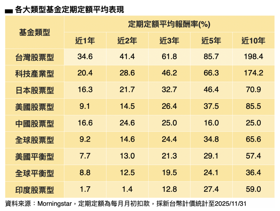 台股11月定期定额投资金额逼近200亿元,刷新单月新高纪录,共同基金市场也同样火爆,根据基富通统计,11月定期定额投资人数近13万人、扣款金额更首度突破30亿元,创平台成立以来单月新高,包括台股、美股、全球股与科技基金都是受青睐的类型。