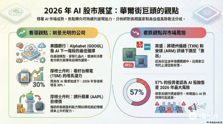 随着人工智能 (AI) 技术从早期的资金投入阶段,逐步转向寻求可持续的获利模式与防御性竞争优势,全球金融市场对2026年的科技股预期呈现出明显的分歧。根据各家外资的最新研究显示,AI领域的获利能力与市场执行力将成为区分赢家与输家的关键,部分科技巨头因拥有深厚的结构性护城河而持续获得看好,而部分估值过高的半导体企业则面临评级下调的压力。