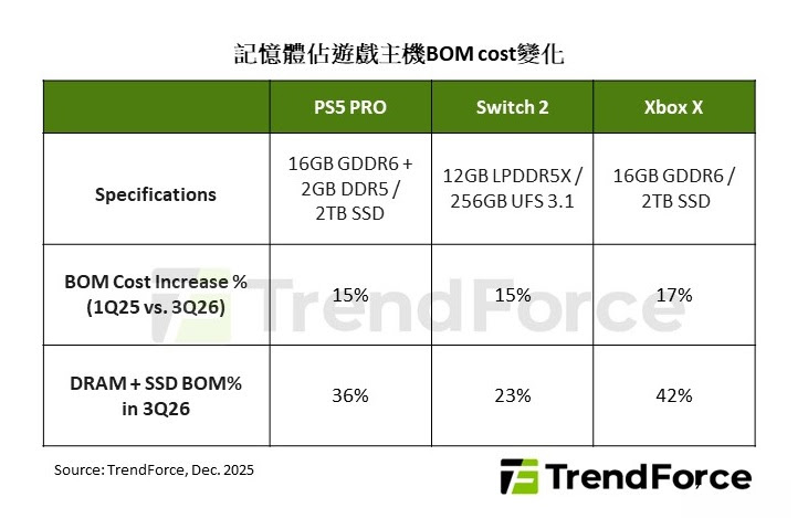 对于Sony与Microsoft而言,2026年超过内存成本占BOM cost超过35%的比率将导致主机上市数年后难以执行传统的降价策略,甚至在部分地区需上调售价以转嫁成本,如Xbox便传将继2025年9月上调价格后,再度涨价。于此背景下,厂商恐被迫打破以价求量的产业惯例,转而采取高售价确保获利的防御性定价策略。