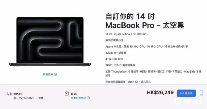 14英寸MacBook Pro M5版本售价由HK$12,999起,配备16GB内存及512GB存储空间,提供太空黑及银色两款颜色。产品于10月15日开始预订,10月22日正式出售。至于配备M4 Pro及M4 Max芯片的高端版本,预计要到2026年初才会推出。