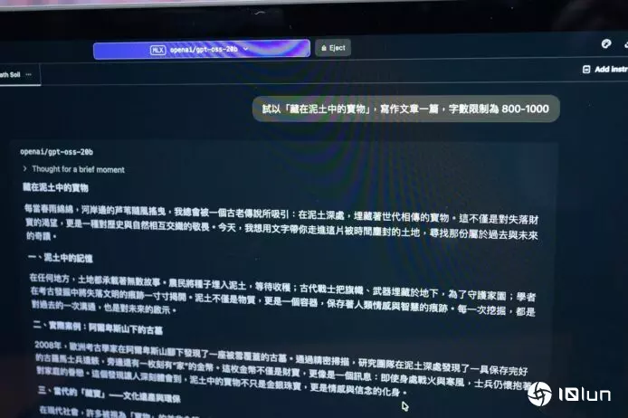 * 测试2:大型语言模型写作任务测试:写作任务,主题为“藏在泥土中的宝物”字数限制800–1000。在LM Studio执行OpenAI gpt-oss 20B模型,比对推理表现