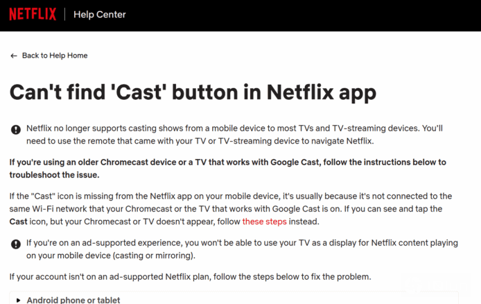 根据Netflix更新支持页面,平台已停止支持从手机投屏节目至大部分电视及流媒体设备。目前只有使用旧版Chromecast设备或原生支持Google Cast电视用户能继续使用投屏功能,但必须订阅无广告方案,月费由17.99美元起。订阅有广告方案用户(月费7.99美元,约港币62元)即使拥有旧版Chromecast设备,都无法使用投屏功能。