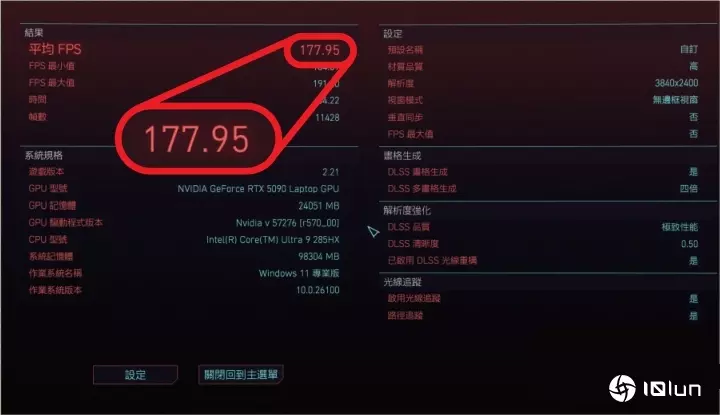 在4K分辨率、打开光追设置下,选定DLSS 4X后, 帧率可达到177.95 FPS。