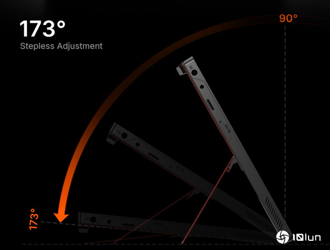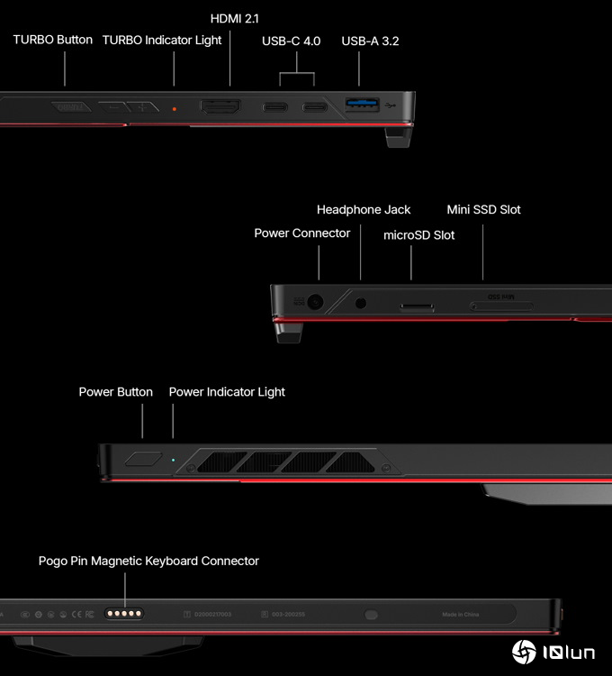 在存储设备方面,Super X可选择容量为1或2 TB的PCIe Gen 4x4、NVMe、M.2 2280固态硬盘,此外还可以通过Mini SSD与MicroSD扩展存储容量。在I/O端子部分具有2组USB4,以及USB 3.2 Gen 1、HDMI 2.1、3.5mm音频端子各1,并可通过底部的磁吸端子连接键盘,机背的脚架可在90-173度之间调节角度。