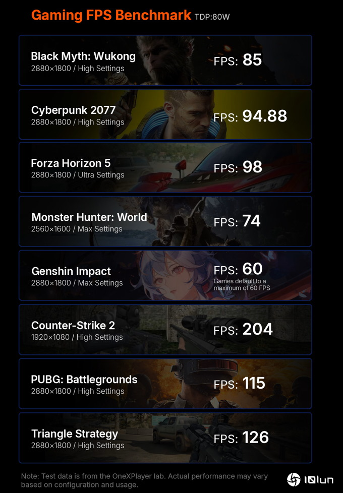 OneXPlayer官方提供的游戏性能参考数据,多款游戏能在高、最高等画质设置、2880 x 1800分辨率有着流畅的FPS性能。