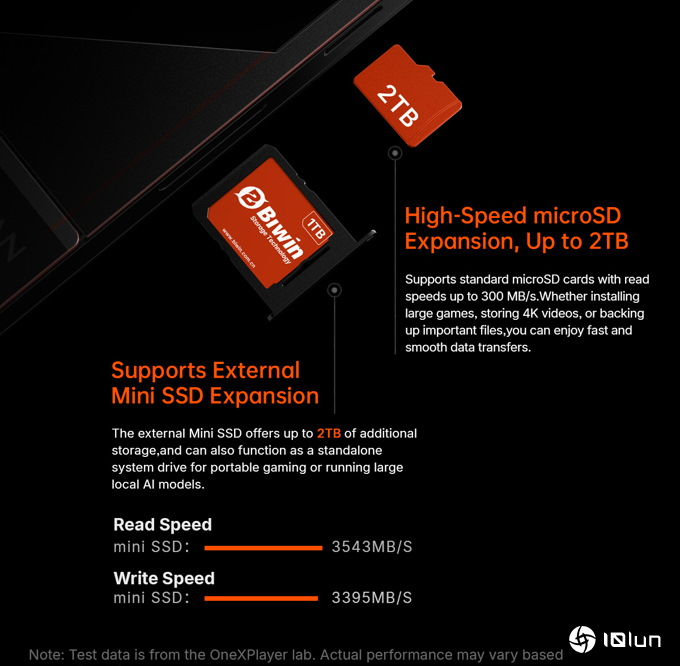 用户还可以通过Mini SSD与MicroSD扩展存储容量,2者的传输性能最高分别可达3543 MB/s、300 MB/s。
