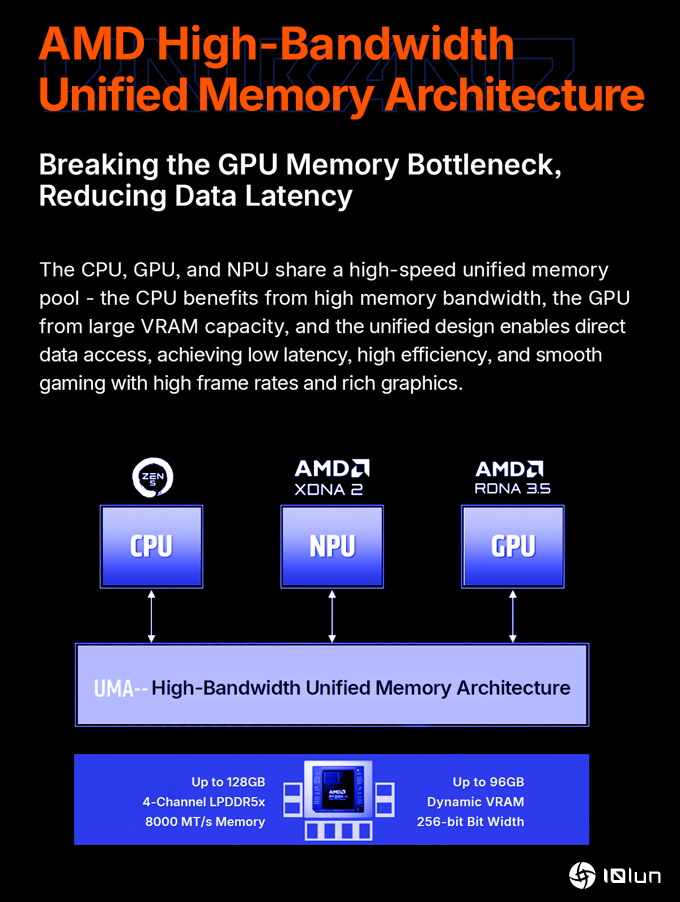 Ryzen AI Max+ 395处理器的处理器(CPU)、绘图处理器(GPU)、神经处理器(NPU)都能进行AI运算,并访问容量最高达128 GB的统一架构内存。