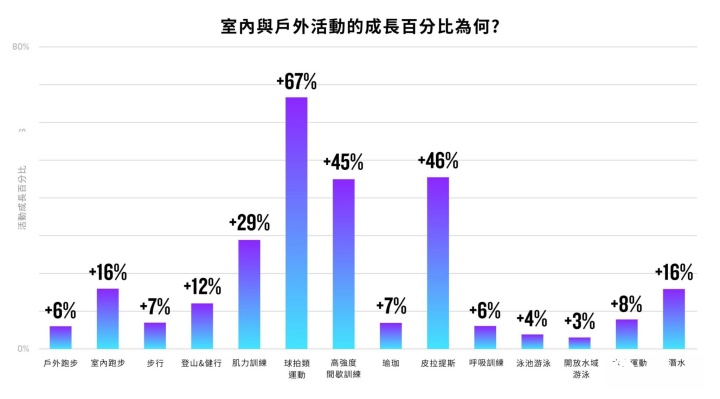 其中亚洲整体活动量增长7.8%,且数据显示亚洲用户更加着重于“有氧,肌力”的平衡发展,新兴的球拍类运动热度也快速攀升。而在台湾,跑步与步行稳居前两名最热门运动,肌力训练也以将近25%的年增长率持续增长。