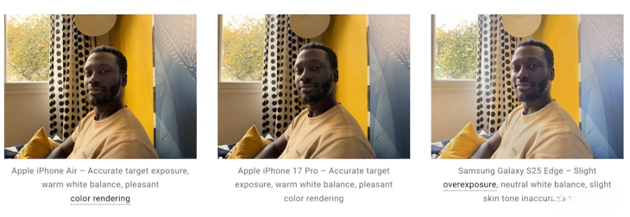 不过,缺点也相当明确,由于缺乏望远与超广角镜头,iPhone Air在拍摄弹性上不如竞争对手。例如同级的Samsung Galaxy S25 Edge就内置超广角模块,在场景切换与构图自由度上具备明显优势;DXOMARK认为,这是Air难以进入排行榜前面的关键原因。