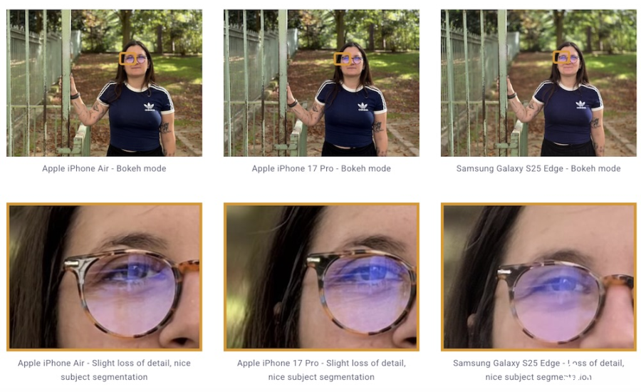 在形象细节方面,iPhone Air在背景虚化(bokeh)与主体分离的测试项目获得不错评价,甚至在部分场景中比Galaxy S25 Edge表现更为精准,显示苹果在场景深度演算上依旧保持领先。