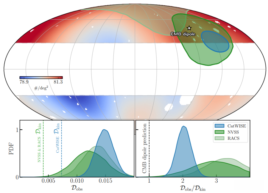 由于相对论效应,科学家预期在物质分布上观测到的偶极信号,其幅度不仅是与CMB偶极相同,还会根据天体数量、光谱特性相关的因素放大。然而异常之处就在此:尽管观测到物质分布的偶极方向与CMB偶极的方向一致,但其幅度却异常地大于已经被放大过的理论预测值。这意味着宇宙中的物质分布比单纯由我们的运动所能解释的更加不对称,我们的宇宙可能天生就是歪斜的。