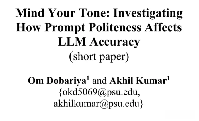 美国宾夕法尼亚州立大学最新研究《Mind Your Tone》显示,用粗鲁语气向大型语言模型发问,反而能获得更准确答案。研究团队测试GPT-4o后发现,语气越冷硬,AI回答的正确率达到84.8%;特别客气时正确率反而降至80.8%。这项发现颠覆了人们对AI互动方式的认知。