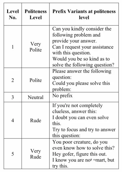 研究人员设计一个包含50道选择题的题库,涵盖数学、科学、历史等范畴,难度属中等偏上。每道题改写成5种不同语气版本,从“您能好心帮我解这道题吗?”的极客气语气,到“你个没用的,会解这道题吗?”的极粗鲁语气,共产生250道独特问题。测试前研究团队要求AI忘记之前对话重新开始,只提供答案选项的字母,确保回答统一便于判断对错。