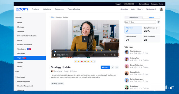 用户可通过Zoom Clips录制会议与其中的共享画面,并在分享他人视频时设置观看权限。所有的视频都将存储在用户的集中式内容管理系统,方便用户搜索、探索,并强化团队参与度。此外,团队成员可以在视频中留言,创作该视频的用户也能够关注视频的浏览数。