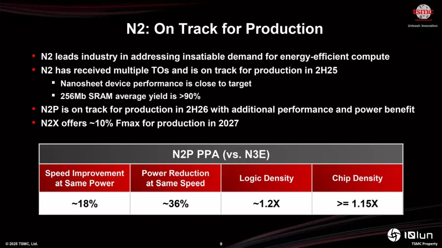 根据台积电提供的数据,N2制程具备全节点的性能与功耗优势,在相同电压下可达到高达26%的速度提升,或节省24-25%的功耗表现。后续的N2P制程在与N3E比较下,速度提升约18%、功耗降低36%、逻辑密度提升至1.2倍以上,显示N2家族将是未来数年内最具竞争力的制程技术。