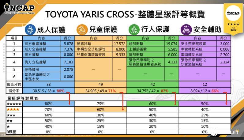 2026年起,TNCAP将启动第二版测试标准,评级更加严苛以外,还会增加本地化评分项目,像是自行车穿越、盲点警示对机车的效用等,现在的五星车辆,若不与时俱进,恐怕还会掉星星。
