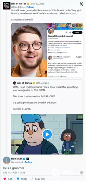 Tesla行政总裁Elon Musk宣布取消Netflix订阅,起因是该流媒体平台雇佣的动画导演Hamish Steele,涉嫌在社交媒体上对保守派活动家Charlie Kirk之死发布争议性言论,并在Netflix动画推广跨性别内容。