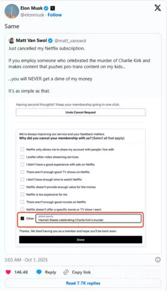 前能源部核科学家Matt Van Swol在社交平台X公开表示已取消Netflix订阅,并写道:“如果雇佣一个庆祝Charlie Kirk被谋杀、制作向我孩子推广跨性别内容的人,你永远拿不到我一分钱”。Musk直接回复“Same”(我也是),确认已取消订阅。